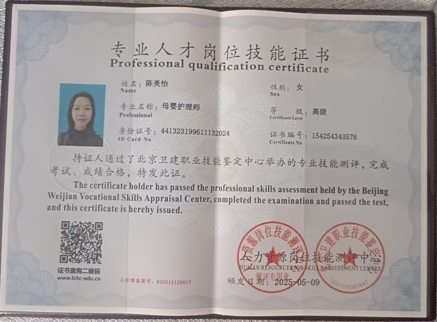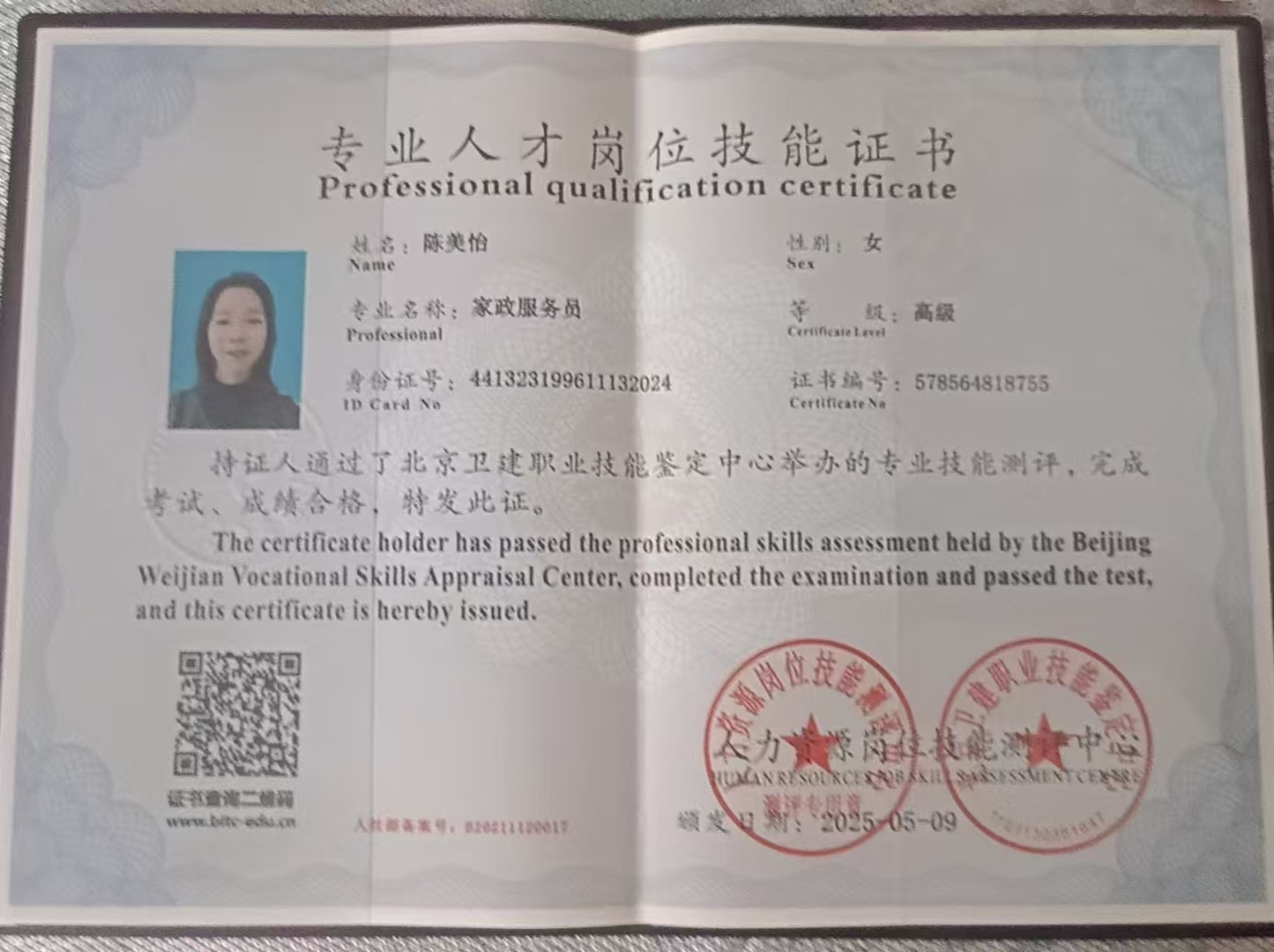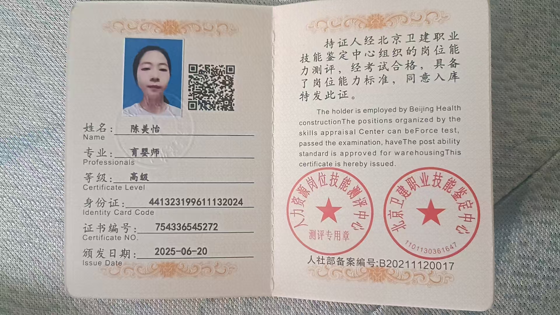 陈美怡性格温和好相处,善良有爱心,工作积极主动,踏实肯干,年轻有精力能量满满,爱干净,喜欢宝宝,对宝宝有耐心和责任心,入户能与客户和谐相处,相信她的服务一定让您满意!