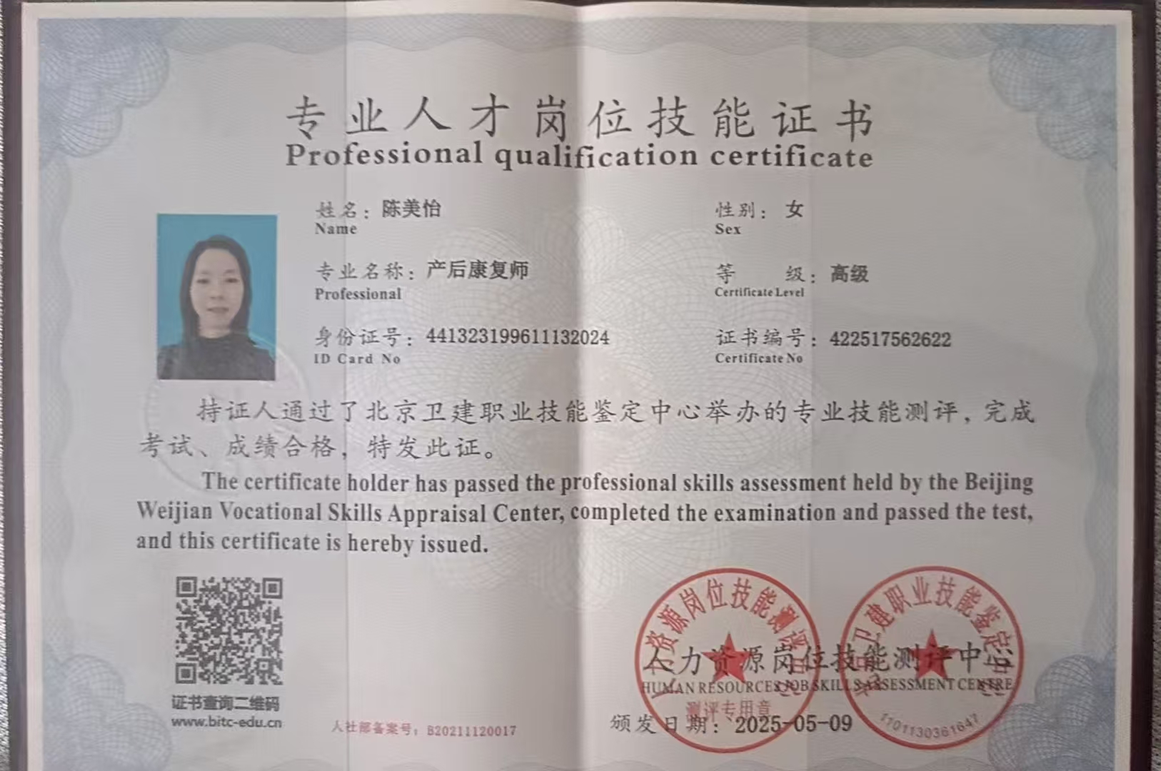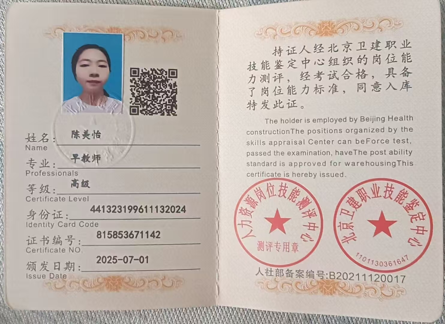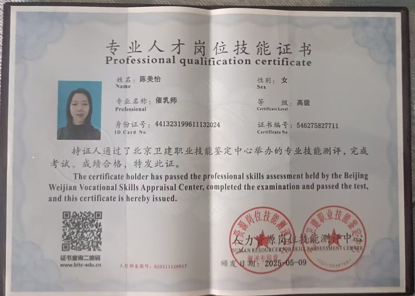 陈美怡性格温和好相处,善良有爱心,工作积极主动,踏实肯干,年轻有精力能量满满,爱干净,喜欢宝宝,对宝宝有耐心和责任心,入户能与客户和谐相处,相信她的服务一定让您满意!