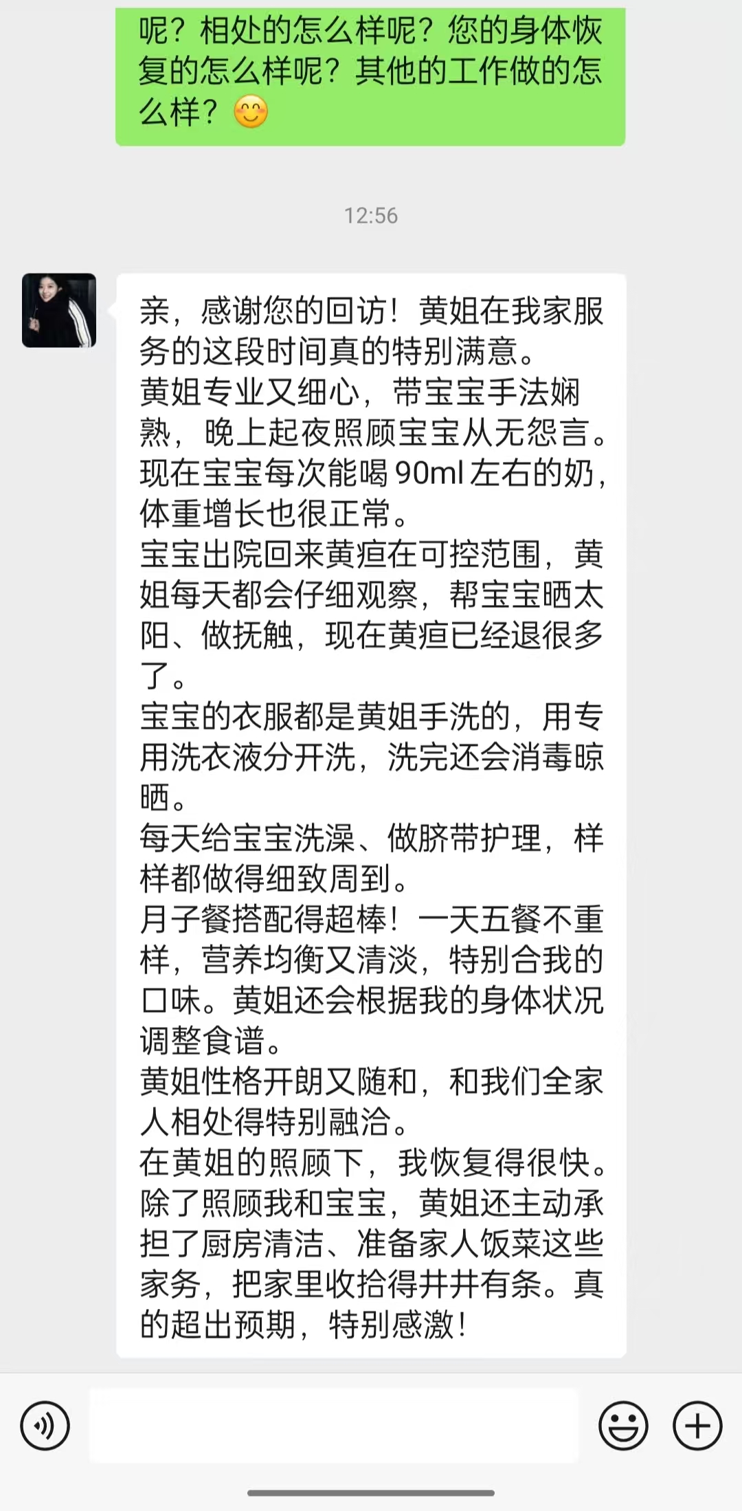 黄美珍性格开朗,做事认真负责,沟通能力强,好评率高,入户能与客户和睦相处,相信她的服务一定让您满意!
