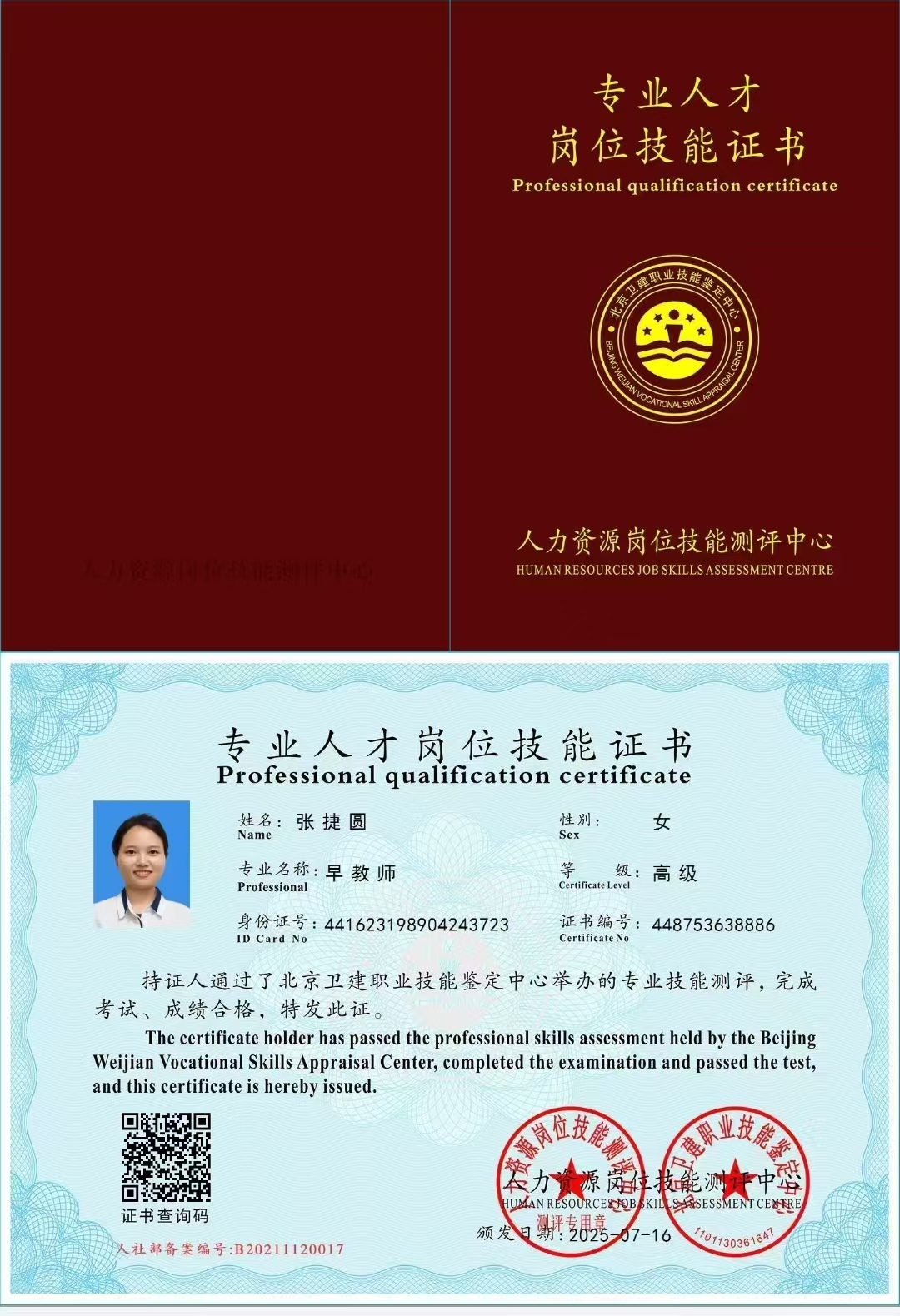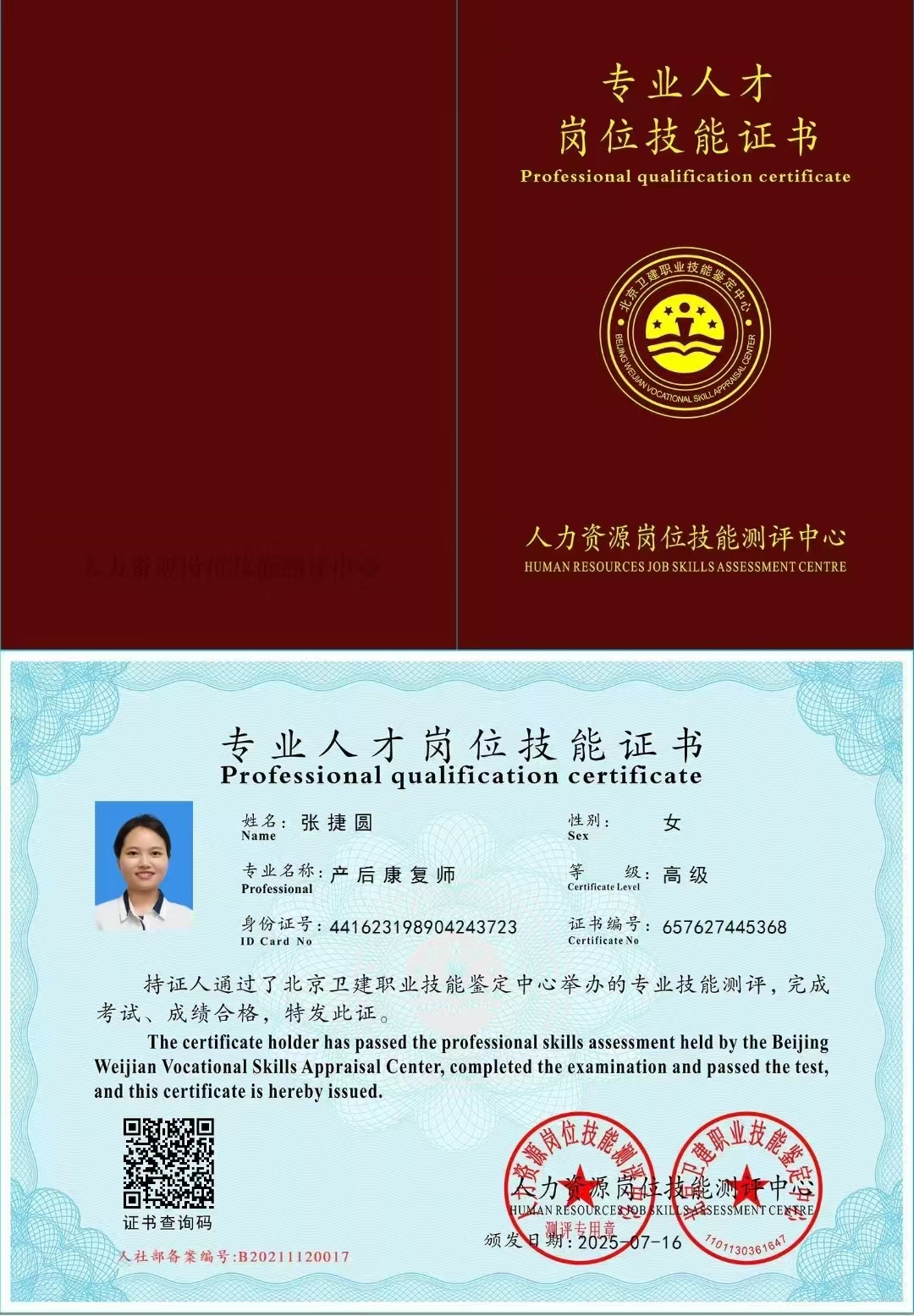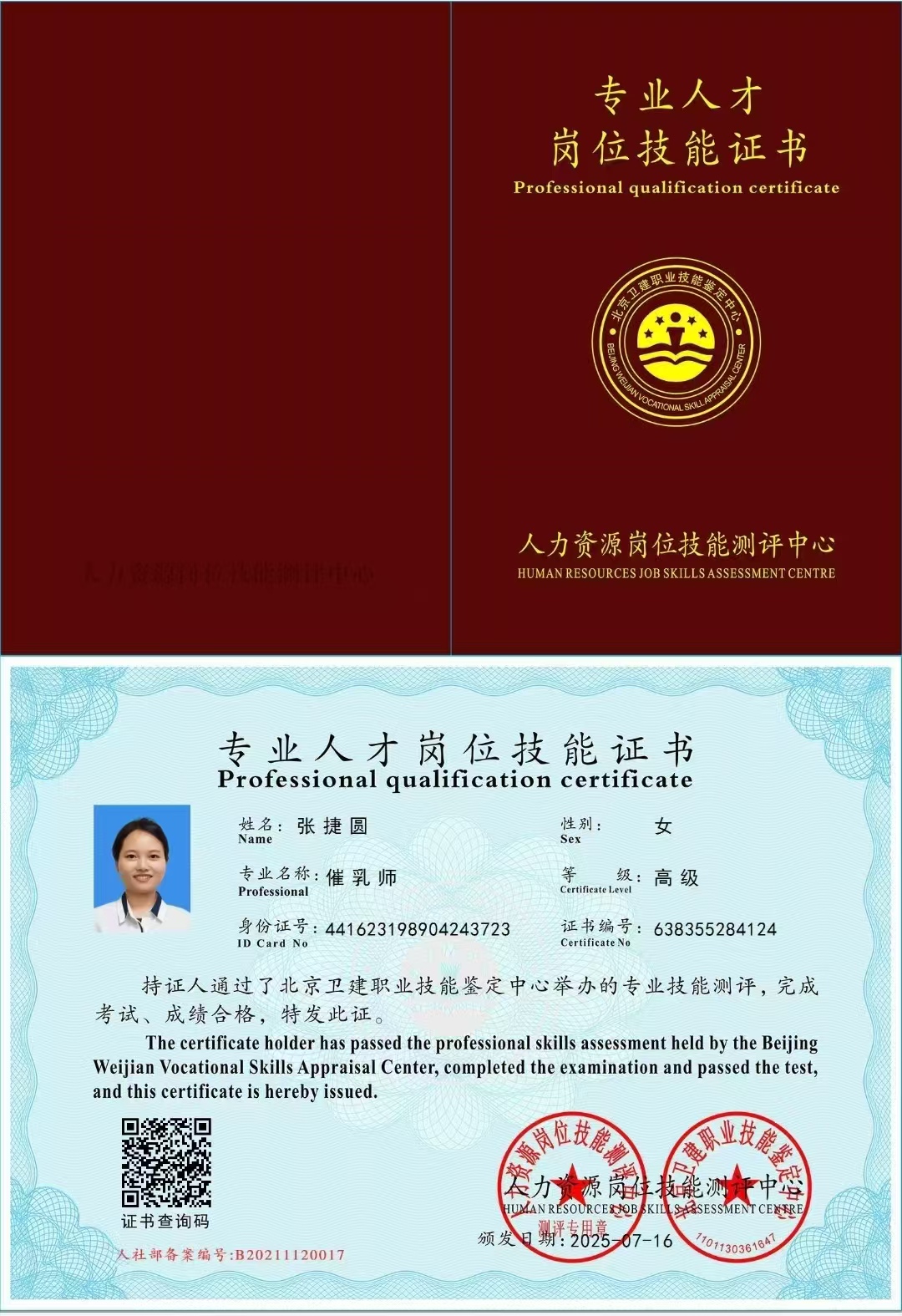 广东河源人,会普通话,客家话,简单英语,性格活泼开朗,为人诚实,做事主动积极细心,不计较,育有3个小孩。有月子会所的工作经验,护理了8个以上新生儿,有育婴师工作经验护理过双胞胎。2016年考证,2025年又考取了催乳师证,小儿推拿师证,育婴师证,产康师证,早教师证,养老护理师证,经过专业的培训,熟练掌握了专业的知识与技能,具备护理新生儿及顺产剖产产妇的经验,在宝宝护理方面擅长黄疸观察,脐部护理,红臀、大小便护理、五官清洁护理,喂奶拍嗝哄睡,洗澡,湿疹的预防及护理,呛奶急救等;产妇护理方面擅长乳房基本护理,开奶生理性涨奶护理,恶露观察,伤口护理,客家月子餐,煲汤,清蒸鱼,黄酒鸡、猪脚姜等清淡饮食又不失美味,喜欢宝宝,通过肢体动作、儿歌、被动操、抚触按摩等方式对宝宝进行启蒙教育。