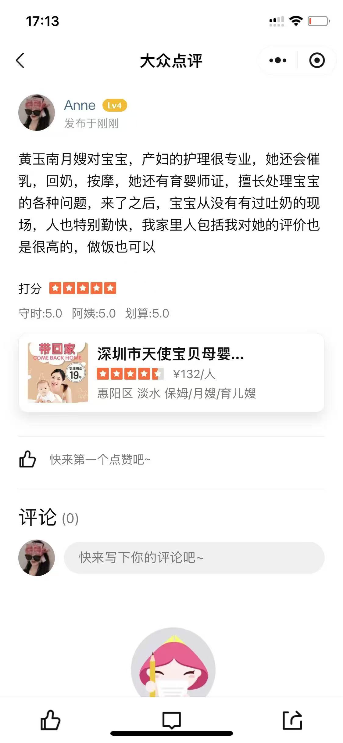 惠州惠东客家人,会普通话,客家话。考取了母婴护理师证,催乳师证,育婴师证。会小儿推拿。会看基础的舌诊面诊。护理了12个以上新生儿和产妇。性格开朗好相处,踏实肯干,做事认真细心,喜欢宝宝,经过专业的培训,熟练掌握了专业的知识与技能,具备护理新生儿及顺产产妇的经验,在宝宝护理方面擅长喂奶拍嗝哄睡,大小便护理,奶瓶消毒,奶粉喂养,母乳喂养,混合喂养,洗澡抚触,黄疸观察护理,脐部消毒护理,口腔护理,红臀、湿疹的预防及护理,呛奶海姆立克急救法等,及时发现宝宝异常情况,安抚宝宝,与宝宝情感交流等;产妇护理方面擅长乳房基本护理,开奶,生理性涨奶护理,指导正确母乳喂养,恶露观察,伤口护理等,喜欢宝宝,通过肢体动作、被动操、抚触按摩等方式对宝宝进行启蒙教育。