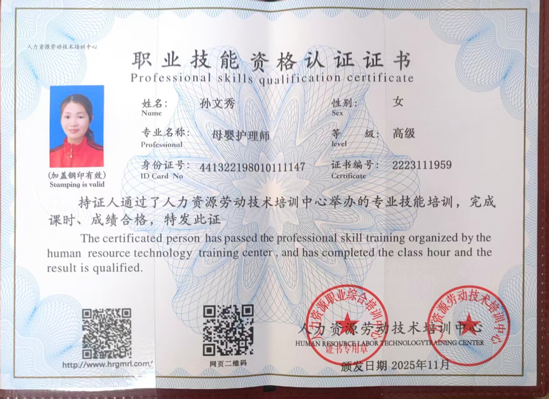 广东惠州人,在惠阳居住,会普通话,客家话,粤语。考取了母婴护理师证。性格温和好相处,吃苦耐劳踏实肯干,做事认真,喜欢宝宝,护理了8个以上新生儿,护理过早产儿出生四斤多的宝宝,护理过3个长单,从出生带到上幼儿园。经过专业的培训,熟练掌握了专业的知识与技能,具备护理新生儿及顺产剖产产妇的经验,在宝宝护理方面擅长喂奶拍嗝哄睡,大小便护理,奶瓶消毒,人工喂养,母乳喂养,混合喂养,洗澡抚触,黄疸观察护理,脐部消毒护理,口腔护理,红臀、湿疹的预防及护理,呛奶海姆立克急救等,及时发现宝宝异常情况,安抚宝宝,与宝宝情感交流等;产妇护理方面擅长乳房基本护理,开奶,生理性涨奶护理,指导正确母乳喂养,恶露观察,伤口护理等,喜欢宝宝,通过肢体动作、被动操、抚触按摩等方式对宝宝进行启蒙教育。