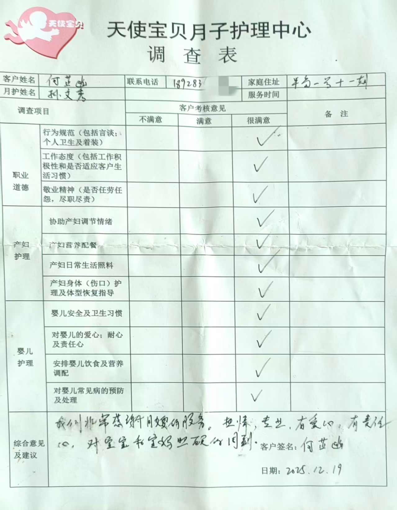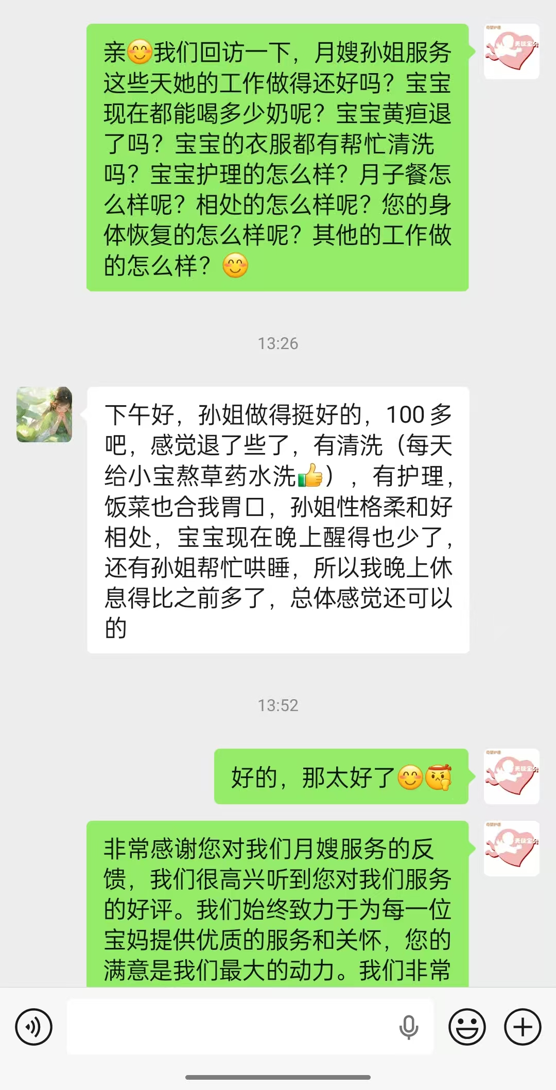 孙姐爱笑有亲和力,诚实善良,做事有责任心,勤快爱干净,虚心学习,眼里有活,尊老爱幼,对宝宝非常有爱心和耐心。服务口碑好,续单率高。擅长做清淡可口美味的客家月子餐,猪脚姜,黄酒鸡,清蒸鱼,煲汤等。做月嫂之前做过幼儿园生活教师,非常喜爱孩子。育有2个小孩,大的15岁了。入户能与客户和谐相处,相信她的服务一定让您满意!