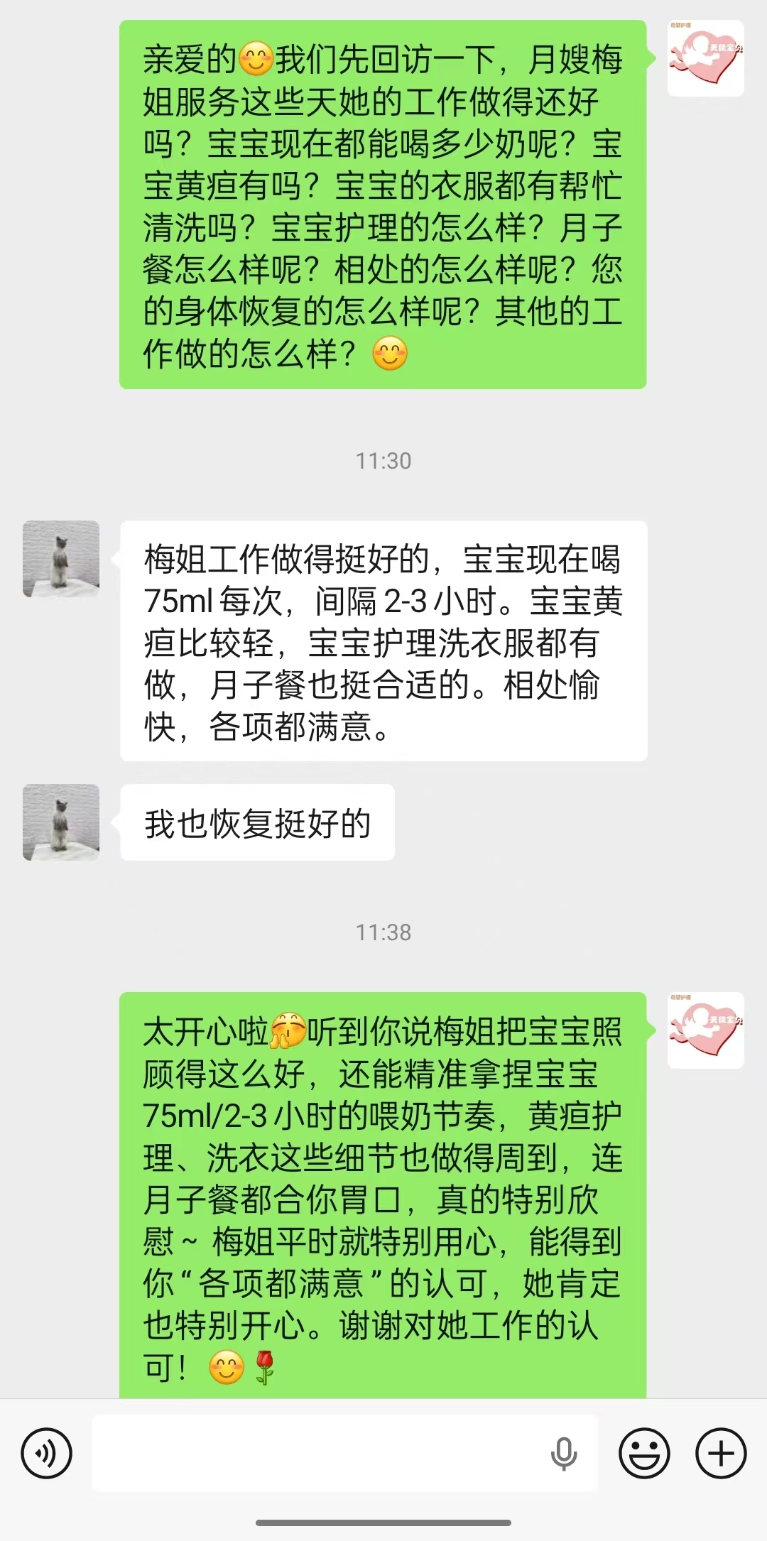 梅姐性格很开朗,很看得开,不计较,很明事理,能够很好的和客户相处和家里长辈相处。做月嫂之前做服装销售店长,有良好的沟通能力和为他人着想的能力。经常多次下户,宝妈都万般不舍。擅长宝宝的洗澡,抚触操,排气操、被动操、脐带护理、黄疸期观察,尿疹护理,早期智力开发等宝宝护理,擅长宝妈的母乳喂养指导,产褥期护理,解决宝妈的乳头凹陷,开奶,堵奶,涨奶等问题。擅长广式月子餐,煲汤,面食都可以,可以根据宝妈不同的体质制作搭配不同的月子营养餐,指导宝妈产后恢复操恢复身体。相信梅姐心贴心的付出给您舒心的月子!