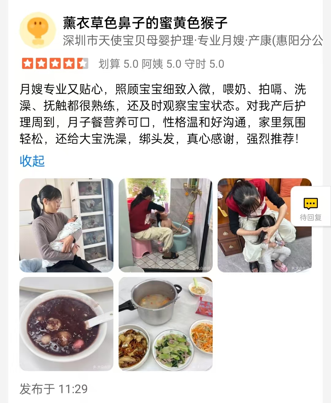 黄玉南阳光开朗爱笑非常有亲和力,诚实善良善解人意,做事有责任心,勤快爱干净。虚心学习,眼里有活,尊老爱幼,对宝宝有爱心和耐心。她说照顾好宝妈的情绪,把宝宝护理好,是她工作一定要做好的。擅长做清淡可口美味的客家月子餐,煲汤,酿豆腐,蒸排骨,清蒸鱼,鸡酒,五红汤等。做月嫂之前在母婴店做了8年,洗澡抚触游泳穿衣哄宝宝母婴用品都很擅长。育有2个小孩,大的上三年级了。入户能与客户和谐相处,相信她的服务一定让您满意!